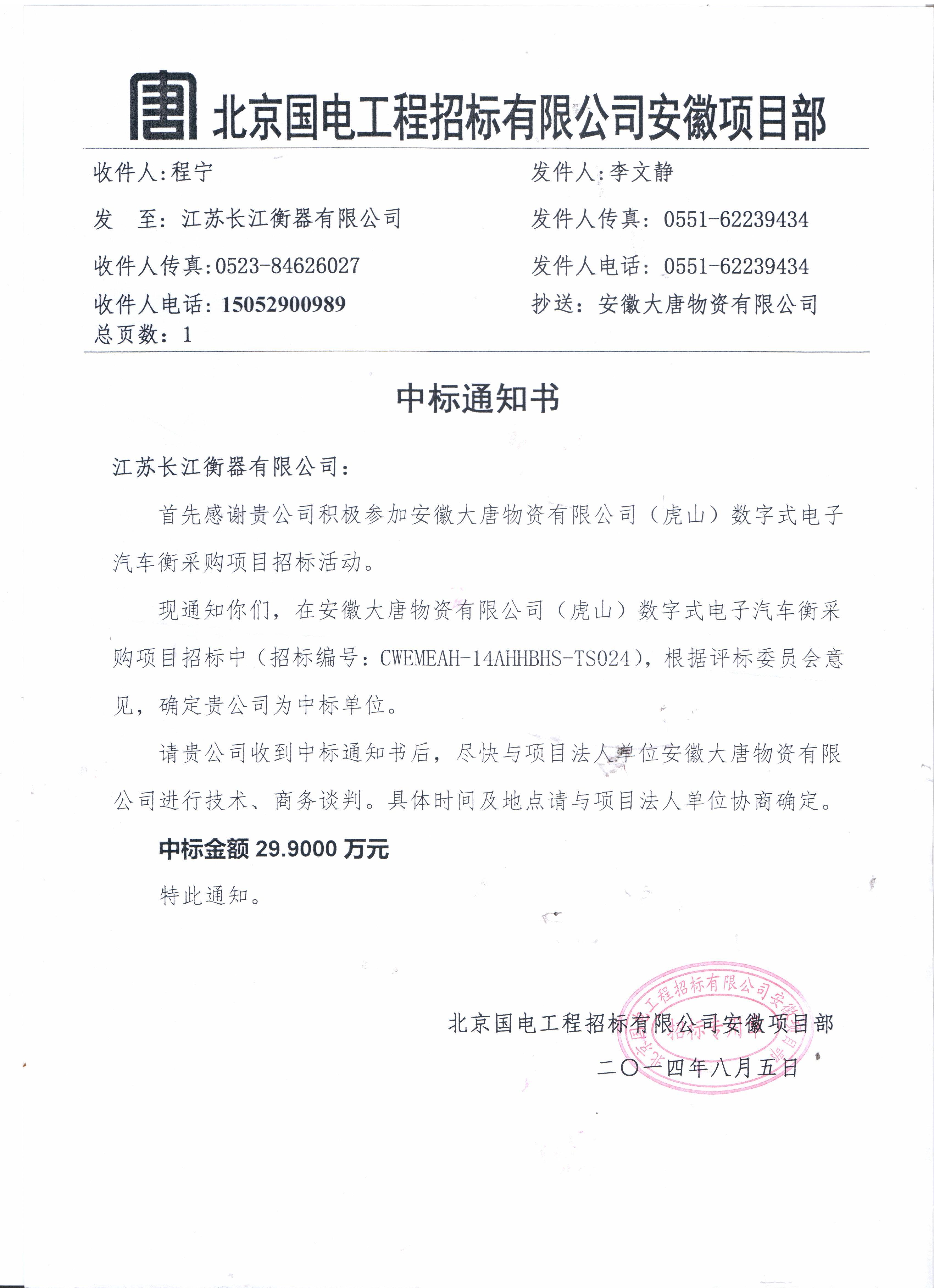 我公司很榮幸參加了北京國電工程招標公司安徽項目部舉行的安徽大唐物資有限公司(虎山)數字式電子汽車衡的招標,我公司榮幸中標!