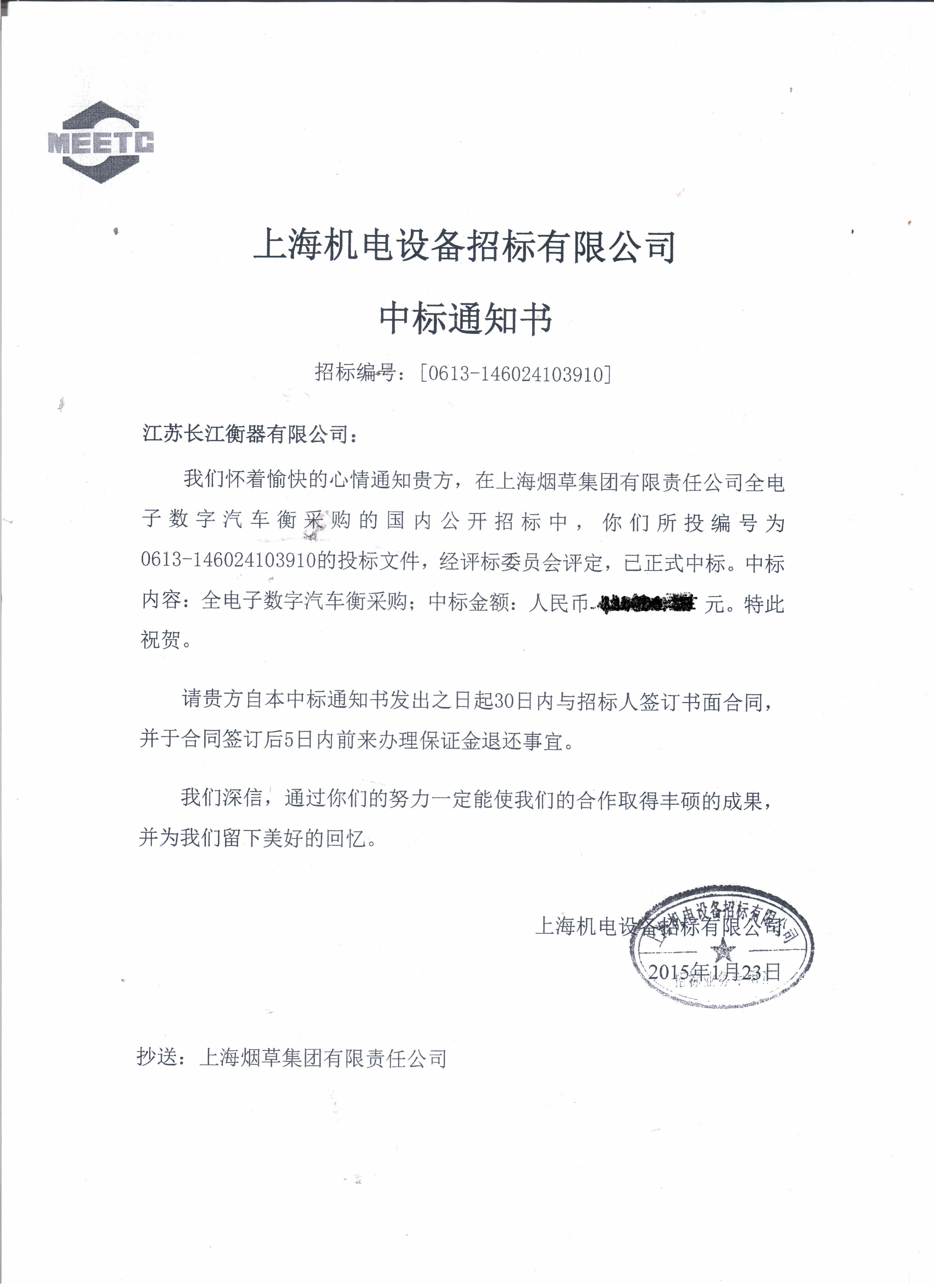 我公司參加上海機電設備招標有限公司招標中,就上海煙草集團有限責任公司全電子數(shù)字汽車衡采購的國內公司招標中,我公司中標!