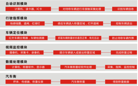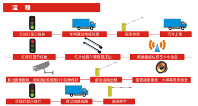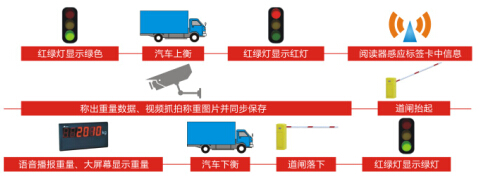 流程:紅綠燈顯示綠色——汽車上衡——紅綠燈顯示紅燈——閱讀器感應標簽卡中信息——稱出重量數據、視頻抓拍稱重圖片并同步保存——道閘抬起——語音播報重量、大屏幕顯示重量——汽車下衡——道閘落下——紅綠燈顯示綠燈